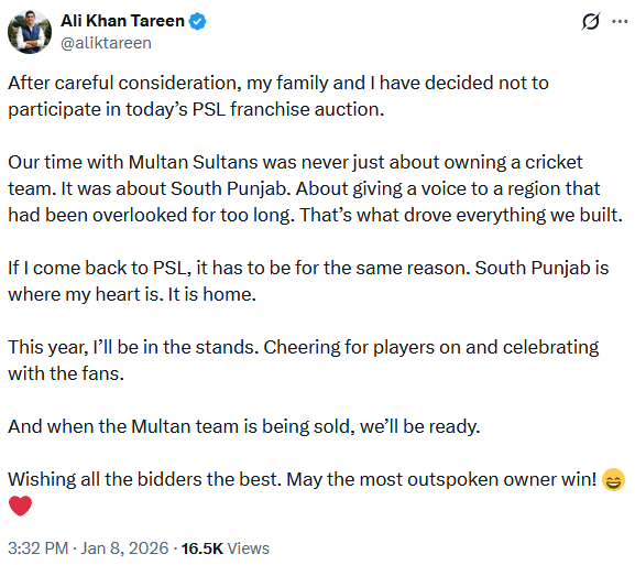 Tareen, whose group was notably absent from the list of 10 qualified bidders, took to X (formerly Twitter) to clarify the move, emphasizing the emotional connection his family shared with the Multan Sultans franchise.