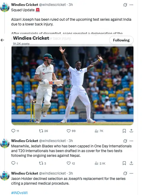 “Alzarri Joseph has been ruled out of the upcoming test series against India due to a lower back injury,” the CWI wrote on X.