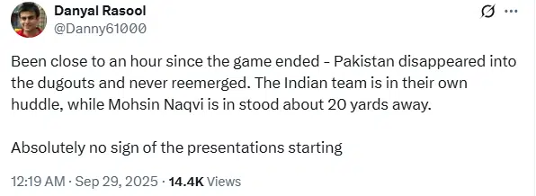 DUBAI: The presentation ceremony for the ACC Men’s Asia Cup 2025 final has been delayed after India triumphed over Pakistan on Sunday here at the Dubai International Cricket Stadium.