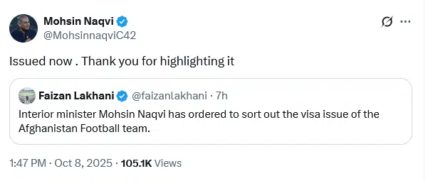 “Issued now,” Mohsin Naqvi wrote in response to journalist Faizan Lakhani’s post, “Thank you for highlighting it,” Naqvi added.