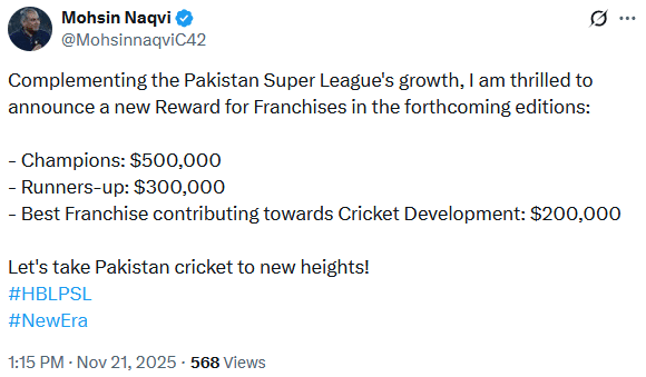 “Complementing the Pakistan Super League’s growth, I am thrilled to announce a new reward for franchises in the forthcoming editions,” Naqvi wrote on his official X account.