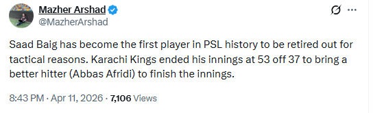 Karachi Kings middle-order batter Saad Baig on Saturday became the first batter in the Pakistan Super League (PSL) history to be retired out for tactical reasons.