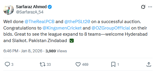 Sarfaraz took to his X account and extended congratulations to the new team owners and the Pakistan Cricket Board (PCB).