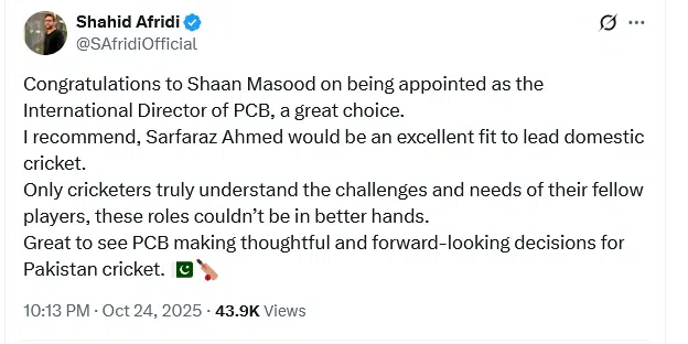 Former Pakistan captain Shahid Afridi has congratulated Shan Masood on his appointment as PCB’s Consultant for International Cricket and Players’ Affairs, calling it a great choice and praising the board for making “thoughtful and forward-looking” decisions.