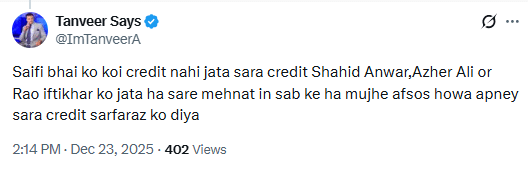 “No credit goes to [Sarfaraz Ahmed]. All of it goes to Shahid Anwar, Azhar Ali and Rao Iftikhar Anjum, as all of the hard work was done by them,” Tanvir replied to Babar’s post on X.
