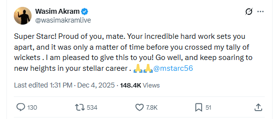 “Super Starc! Proud of you, mate. Your incredible hard work sets you apart, and it was only a matter of time before you crossed my tally of wickets. I am pleased to give this to you! Go well, and keep soaring to new heights in your stellar career,” Akram wrote on X
